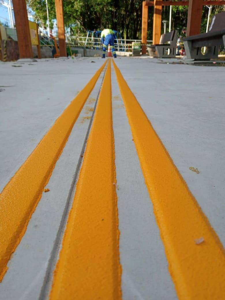 A sinalização tátil e visual no piso, relevos de plástico a frio à base de resina reativa de Metilmetacrilato para que garantam acessibilidade às pessoas com deficiência em todas as suas dimensões, tais como arquitetônica, urbanística, comunicacional, digital, atitudinal, metodológica, programática e universal, bem como o atendimento a Norma Brasileira ABNT NBR 9050:2015 – Acessibilidade a edificações, mobiliário, espaços e equipamentos urbanos, a Norma Brasileira ABNT NBR 16537:2016 – Acessibilidade – Sinalização tátil no piso.